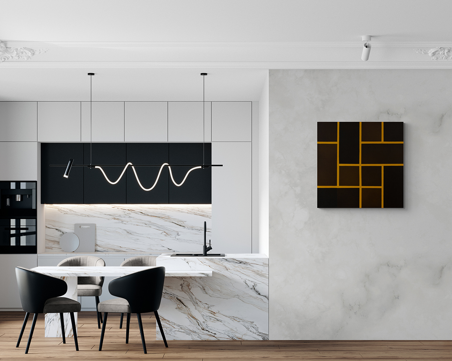 Gemälde: Abstrakt, konstruktiv mit gelben Strukturen auf schwarzem Grund. Minimalistische abstrakte Farbfeldmalerei.