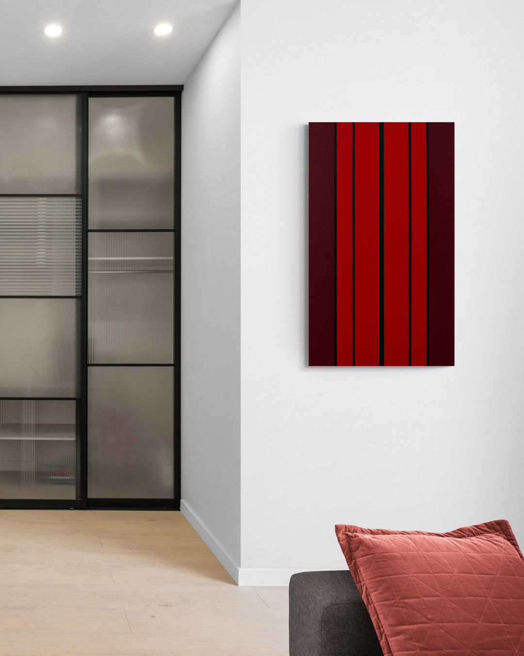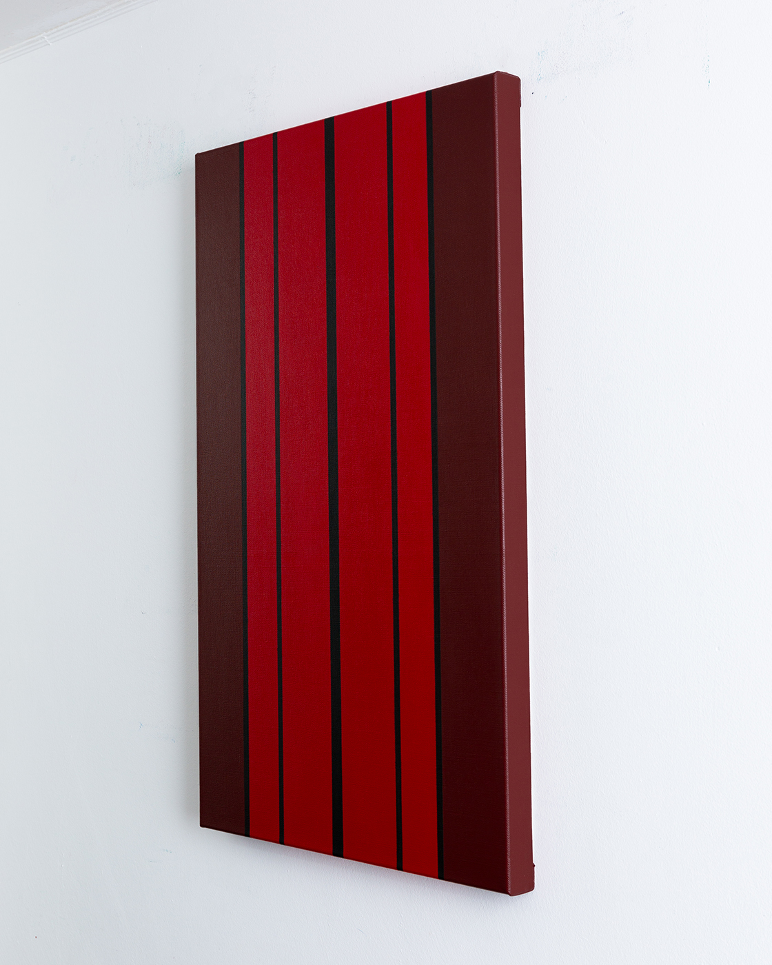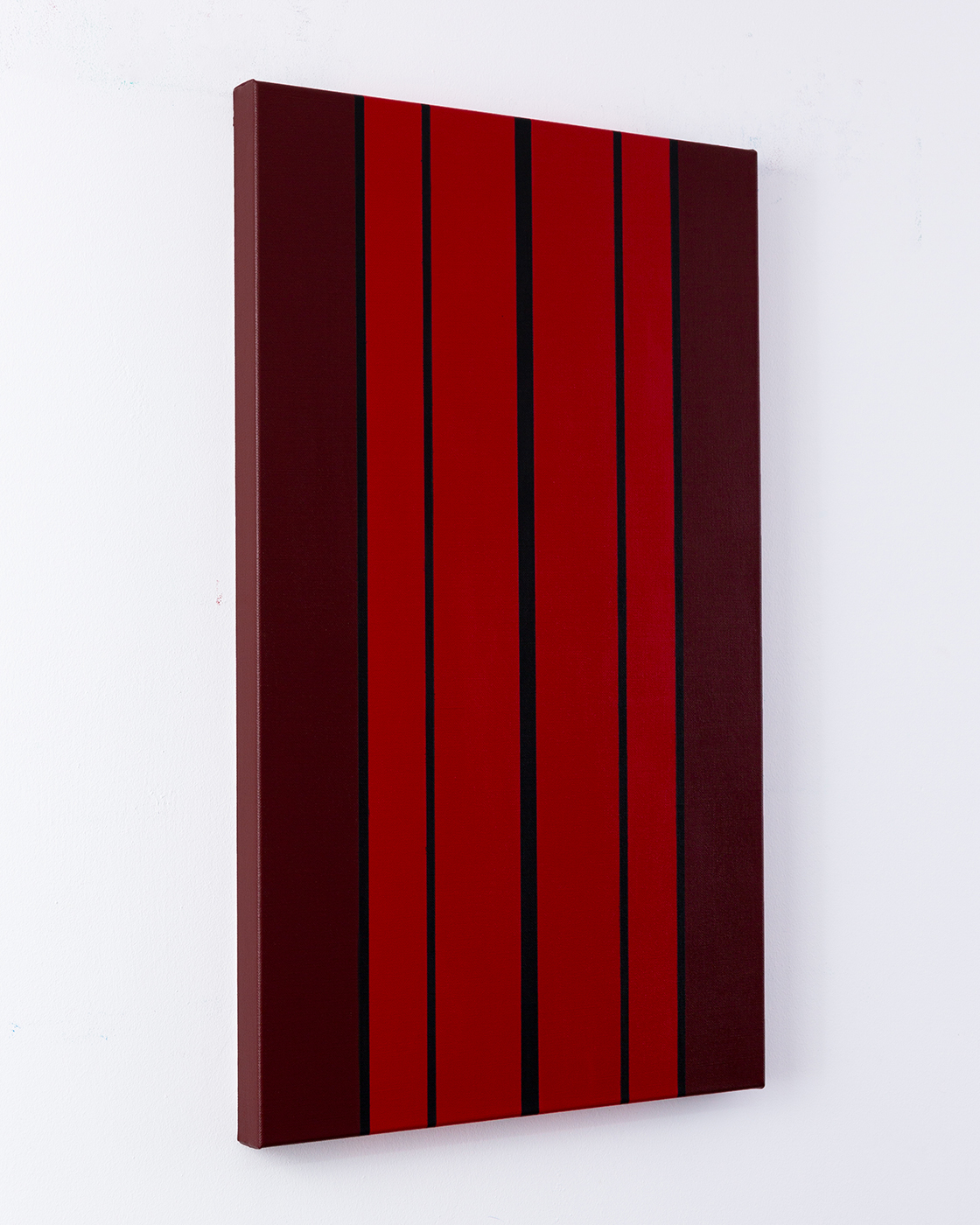 Gemälde: Abstrakt, mit vertikalen roten, dunkelroten, braunen und schwarzen Streifen. Minimalistische abstrakte Farbfeldmalerei.
