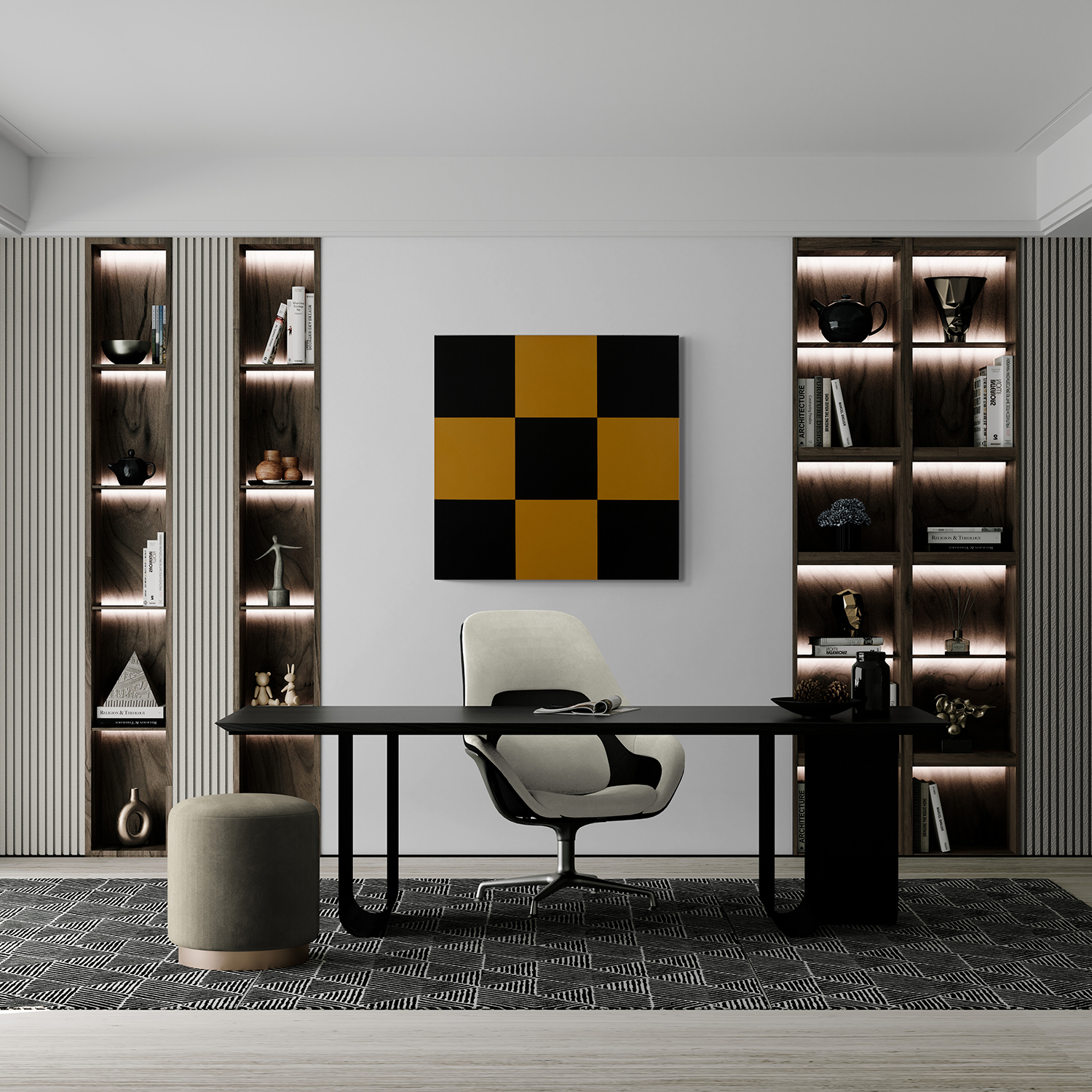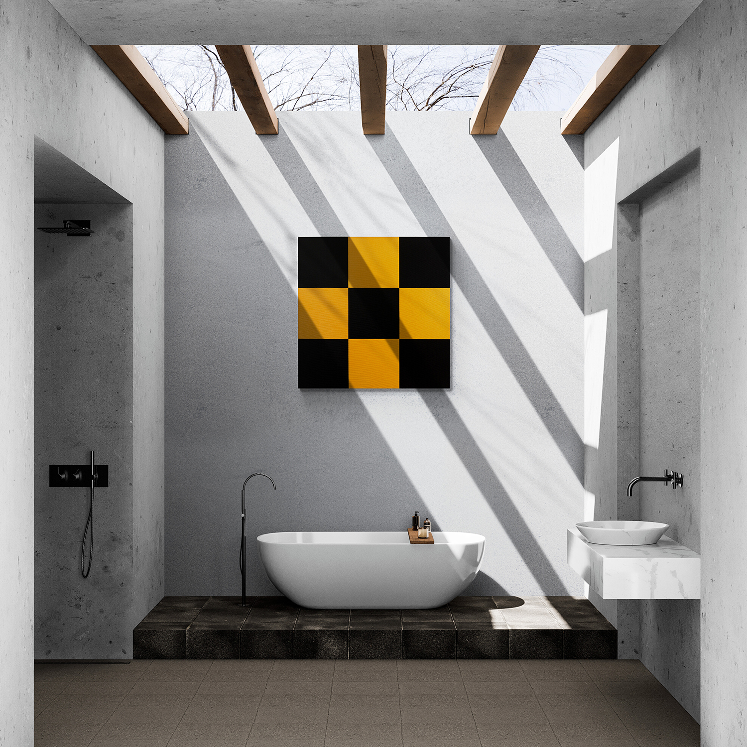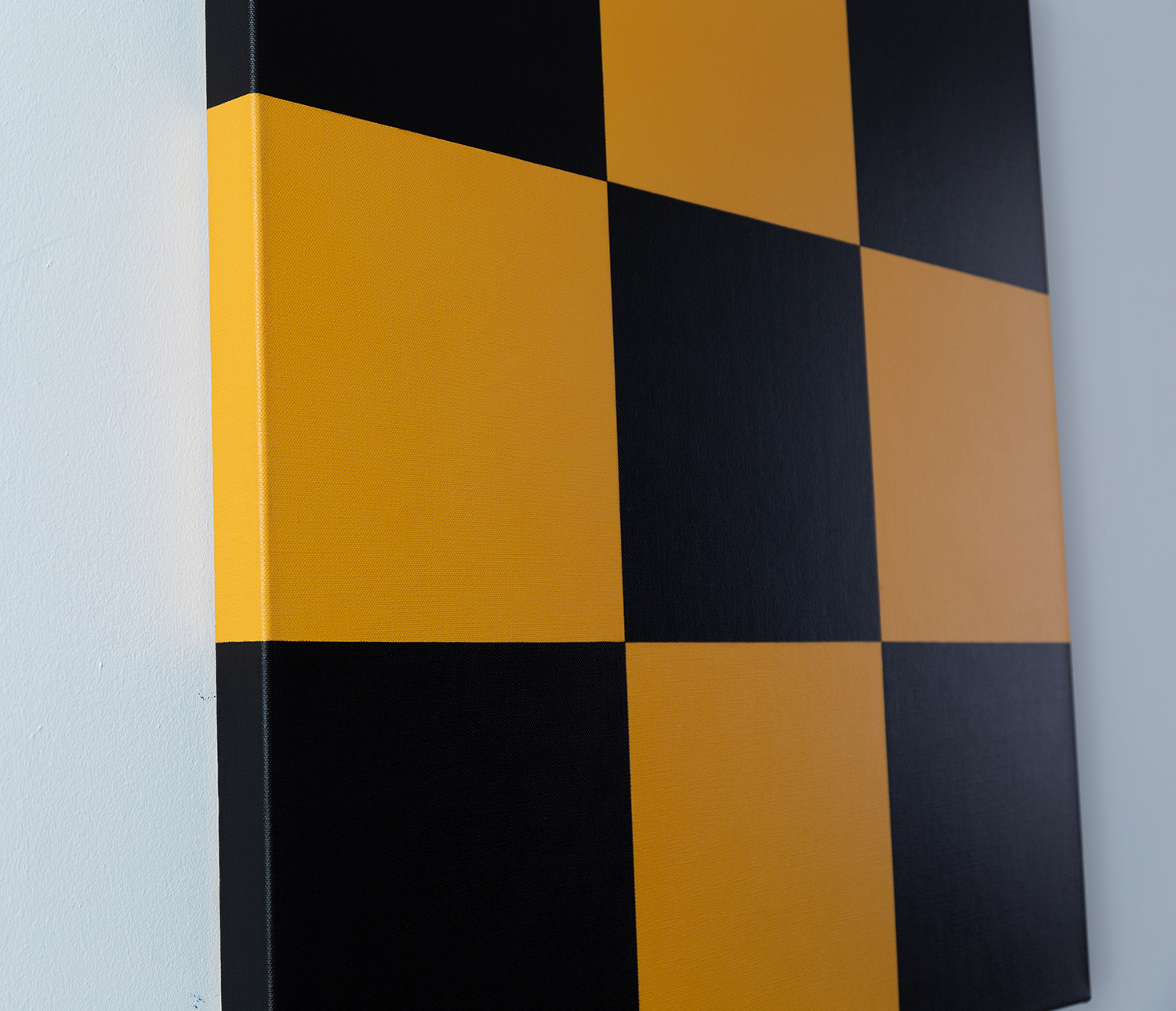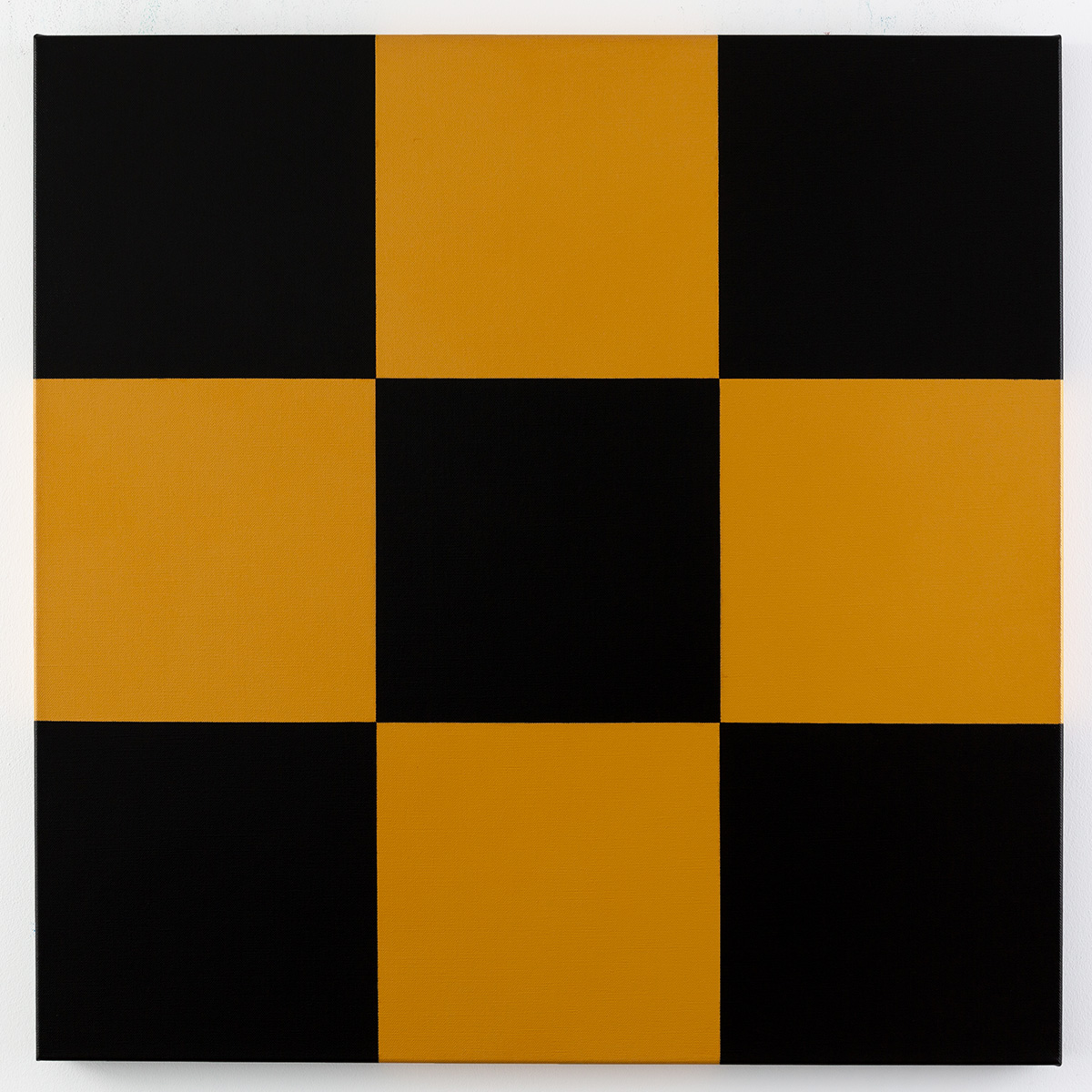 Gemälde: Abstrakte, konstruktive Malerei mit gelben und schwarzen Quadraten. Minimalistische abstrakte Farbfeldmalerei.
