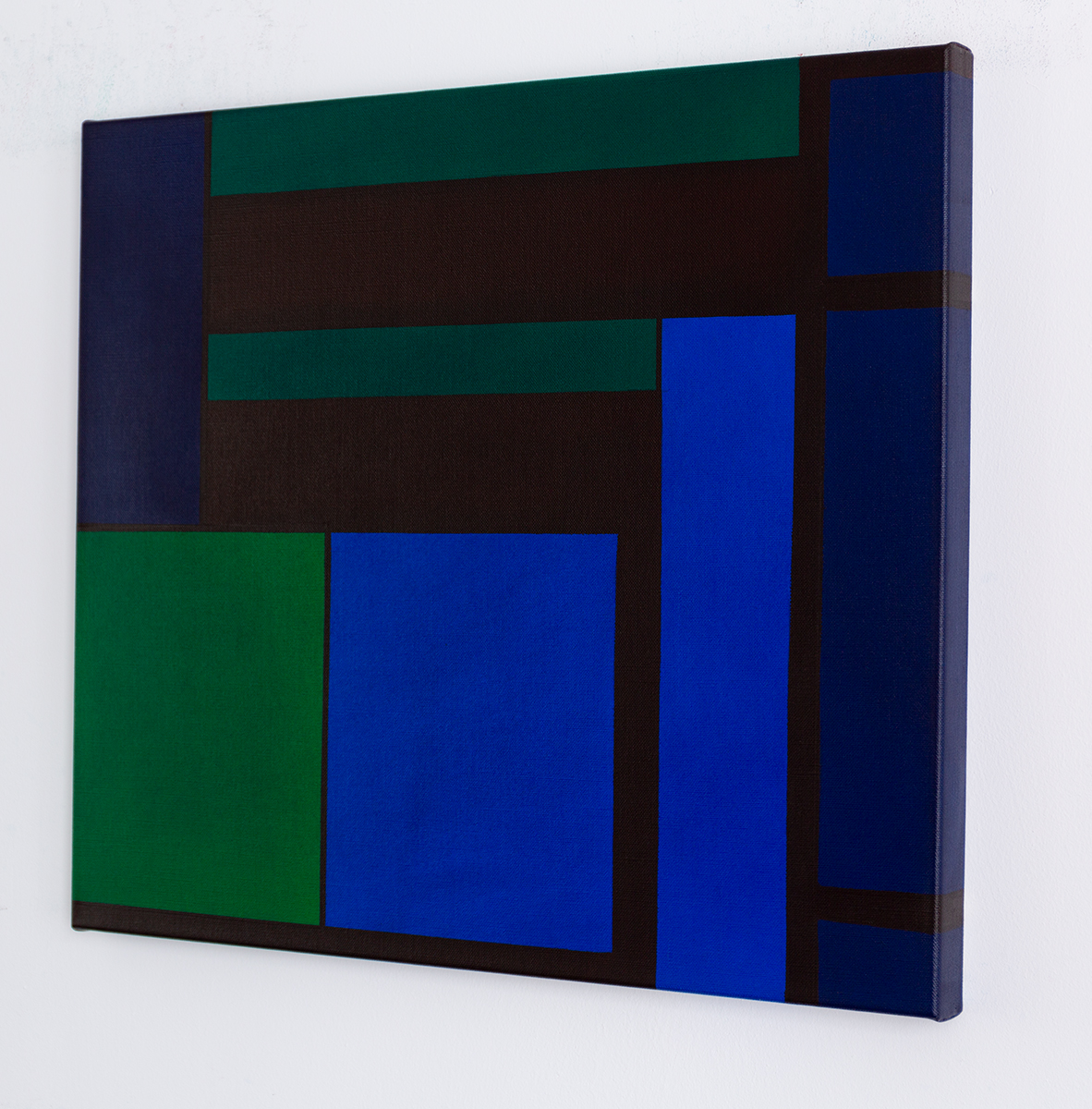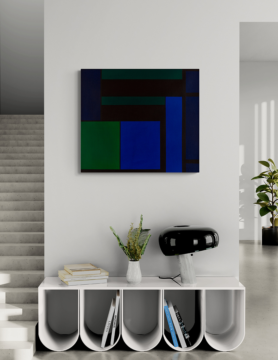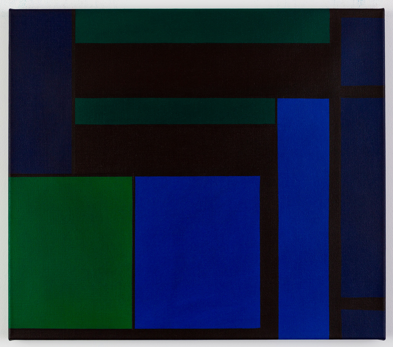 Gemälde: Abstrakt, geometrisch mit blauen, dunkelroten und gruenen Flaechen. Minimalistische geometrische abstrakte Farbfeldmalerei.