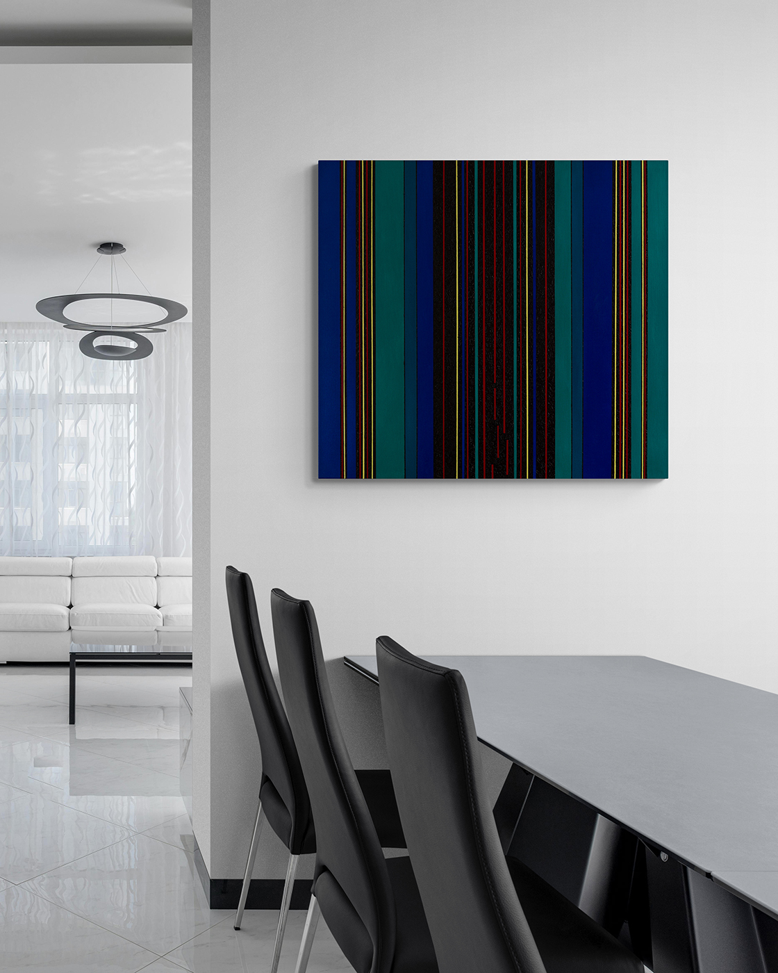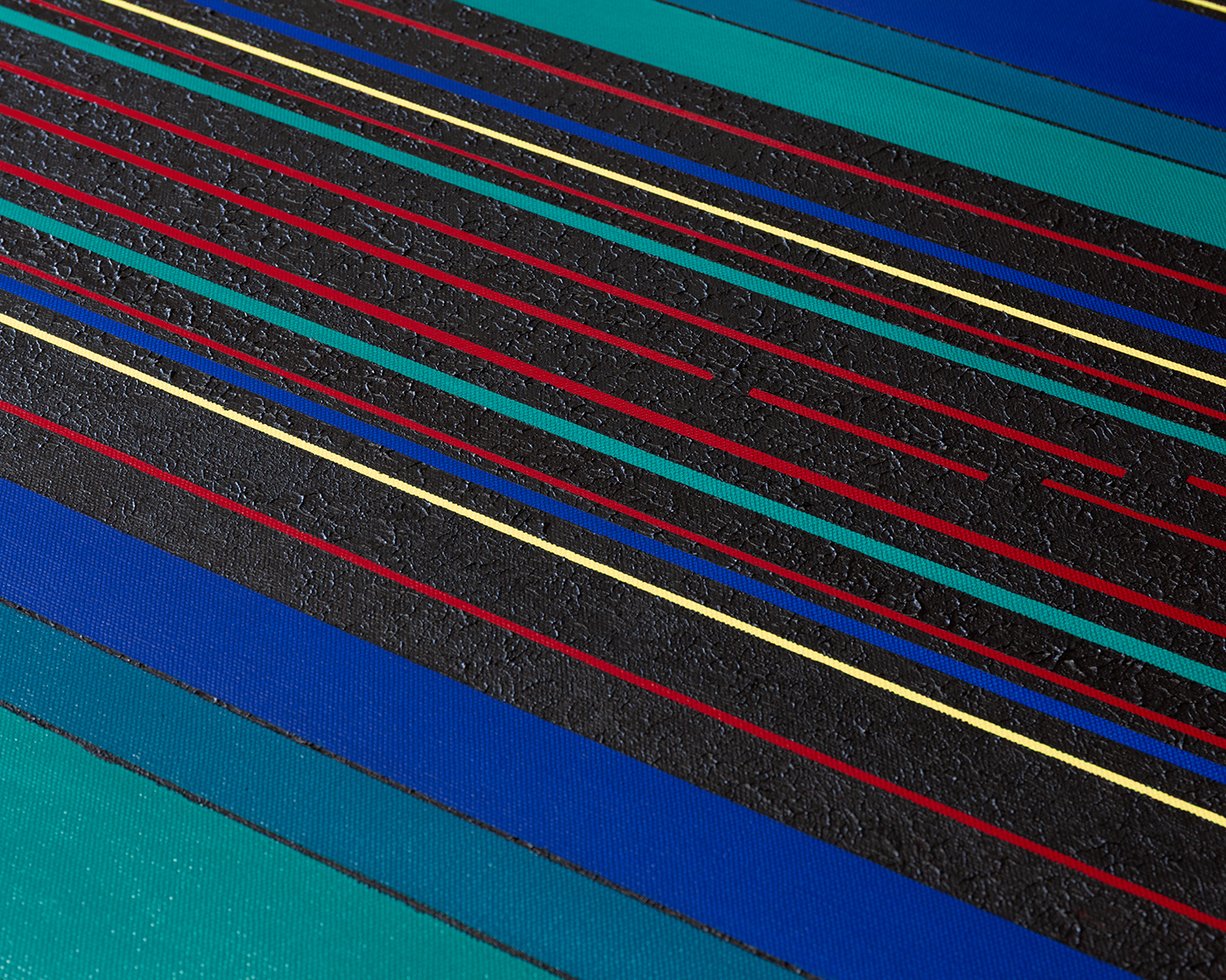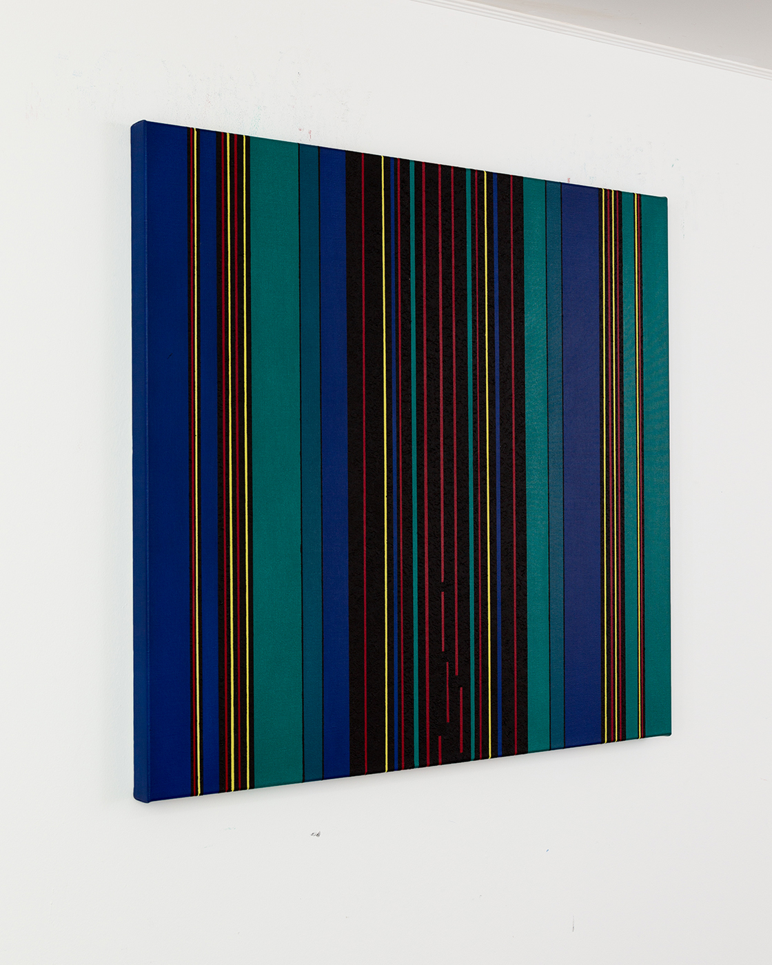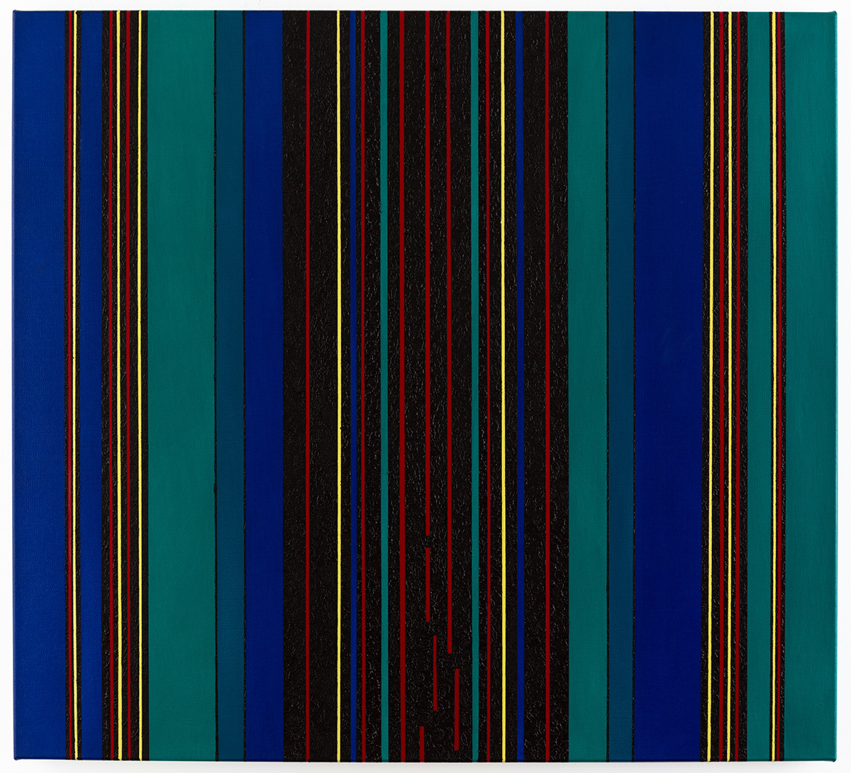 Gemälde: Geometrisch, abstrakt mit senkrechten blauen, grünen, roten, schwarzen und gelben Streifen. Minimalistische Streifen Farbfeldmalerei.