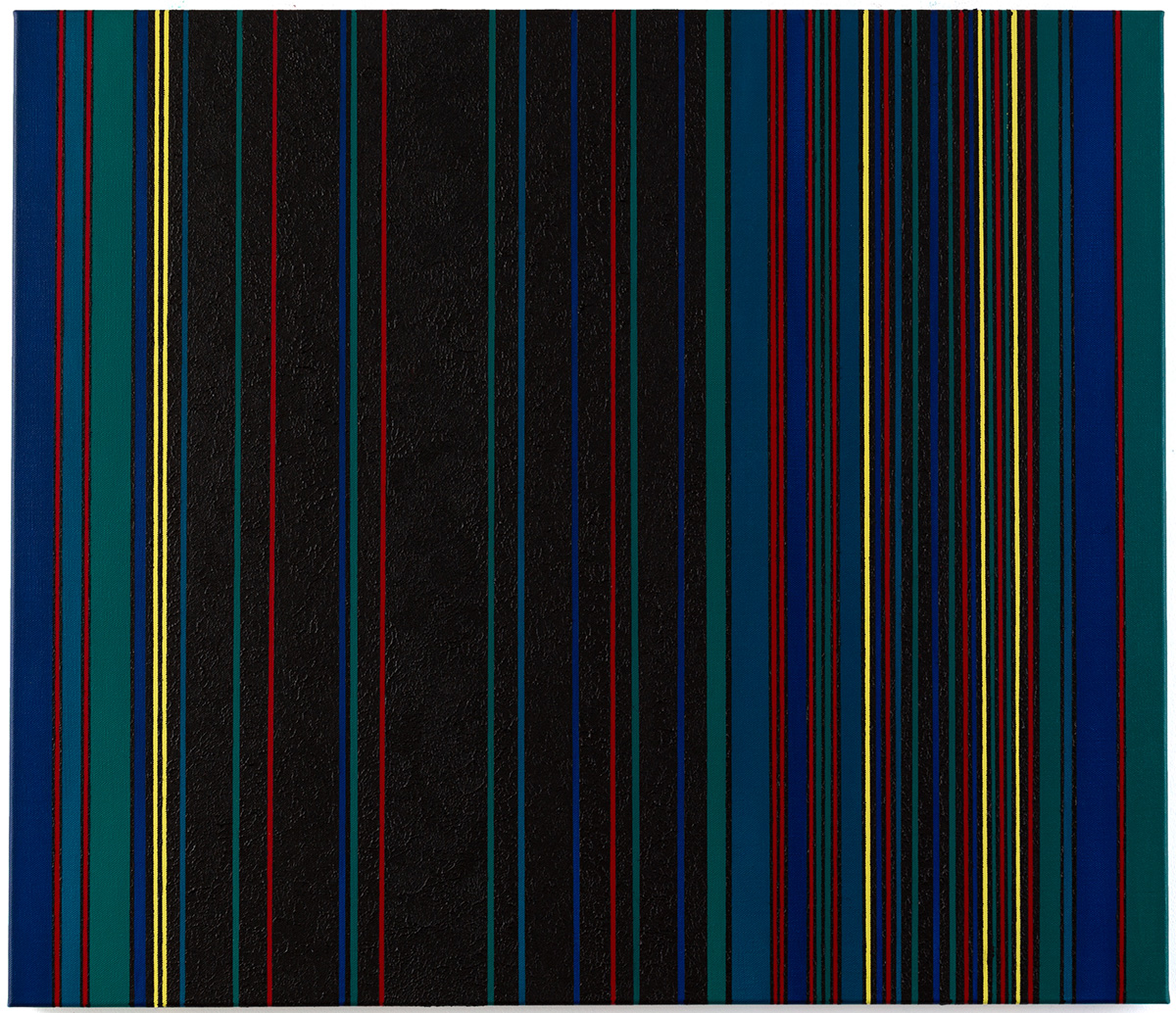 Gemälde: Geometrisch, abstrakt mit senkrechten blauen, grünen, roten, schwarzen und gelben Streifen. Minimalistische Streifen Farbfeldmalerei.