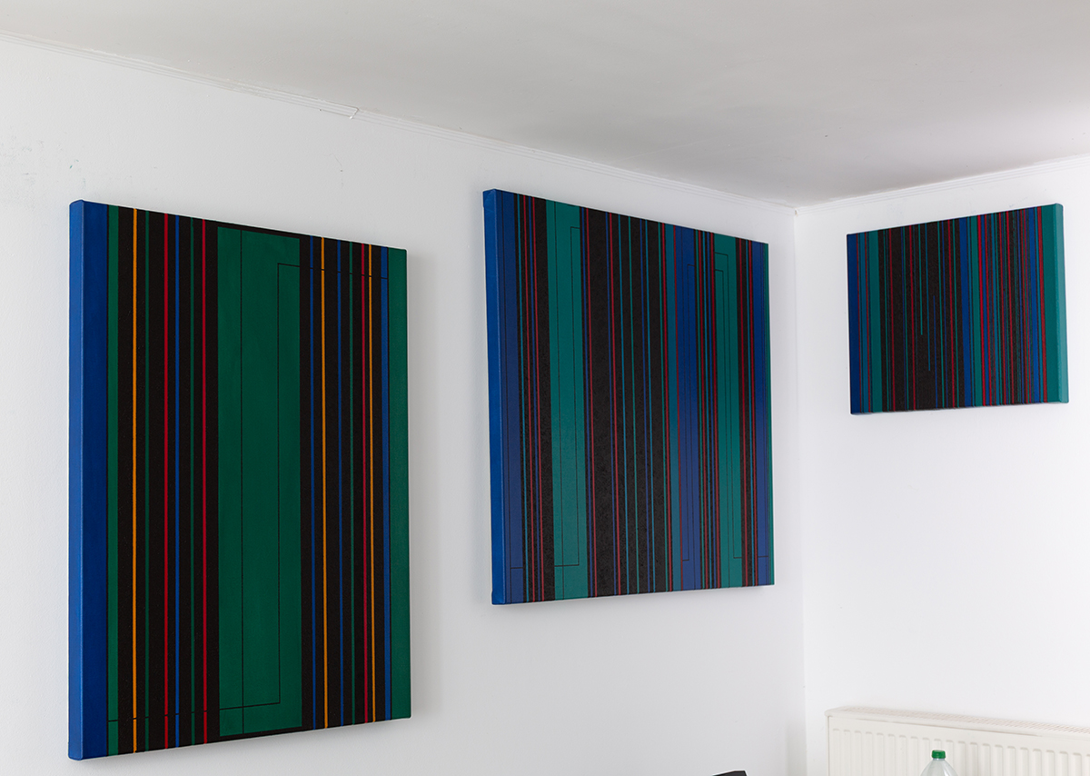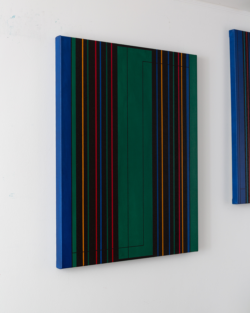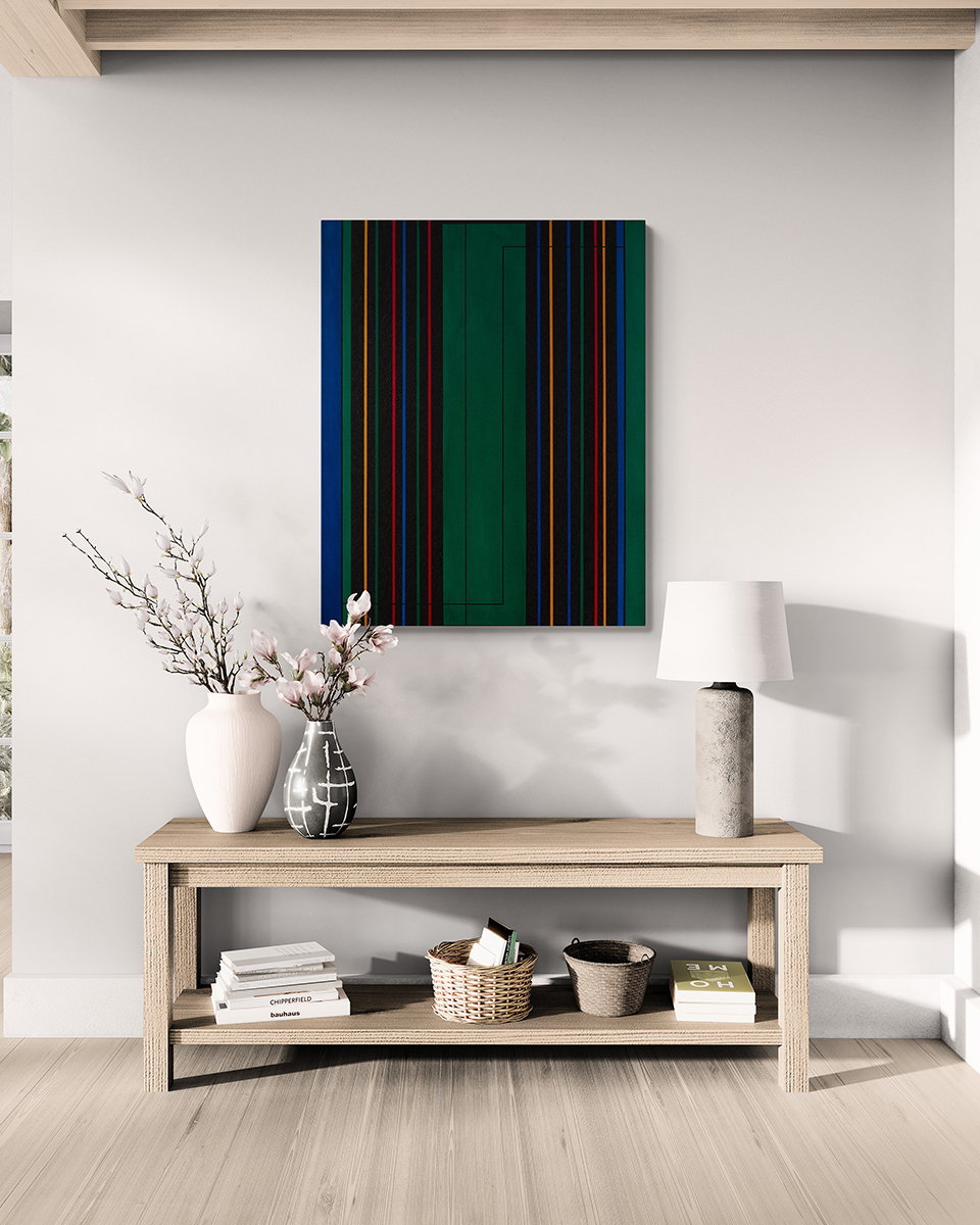 weitere Informationen Dieses Werk verbindet präzise geometrische Strukturen mit einer kraftvollen Farbgebung. Vertikale Linien in Blau, Rot, Gelb und Schwarz bilden eine rhythmische Komposition, die durch tiefgrüne Flächen kontrastiert wird. Das Ergebnis ist ein dynamischer und dennoch ausgewogener Dialog zwischen Ordnung und Bewegung.