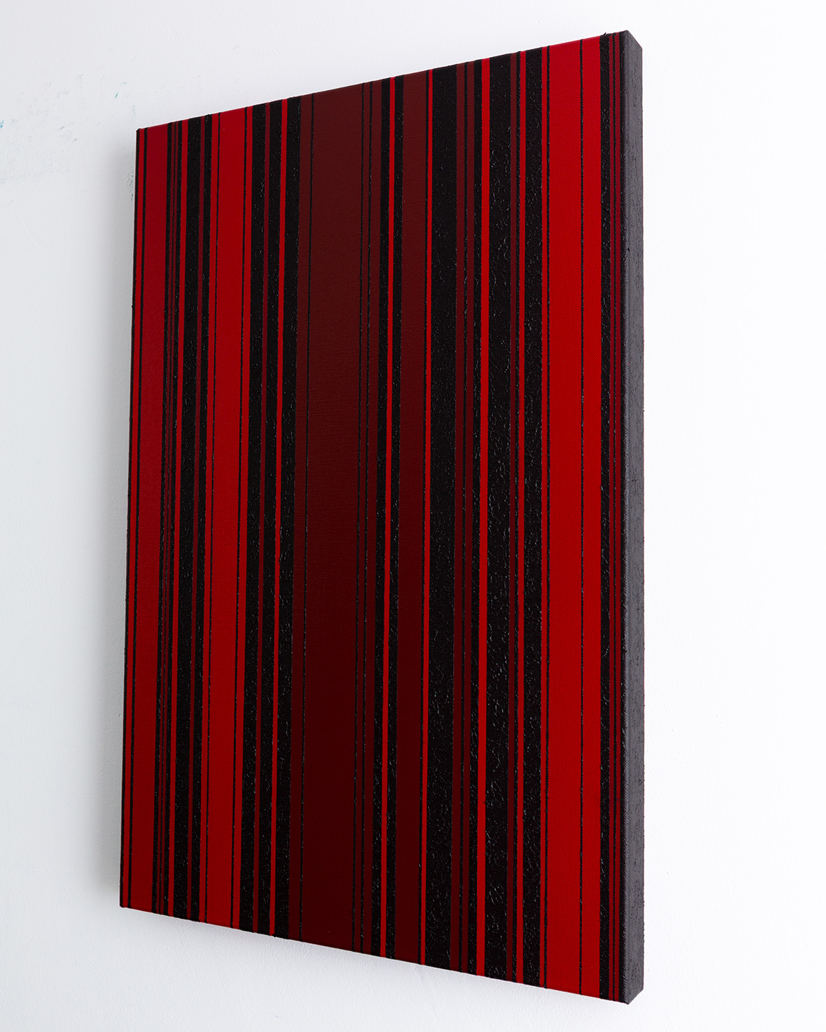 Dieses abstrakte Gemälde untersucht den Rhythmus und die Spannung zwischen Rot und Schwarz durch präzise ausbalancierte vertikale Strukturen.