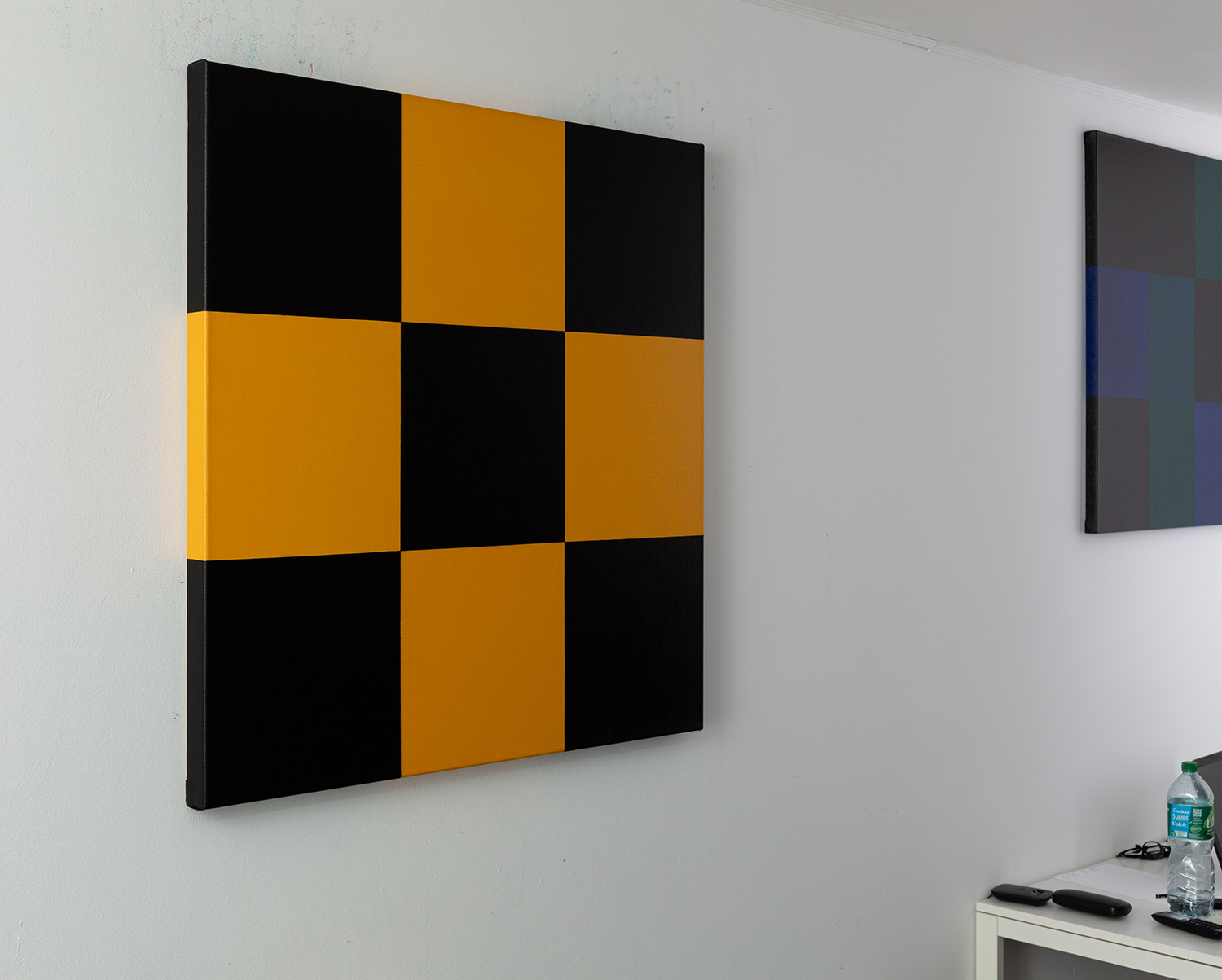 Gemälde: Abstrakte, konstruktive Malerei mit gelben und schwarzen Quadraten. Minimalistische abstrakte Farbfeldmalerei.