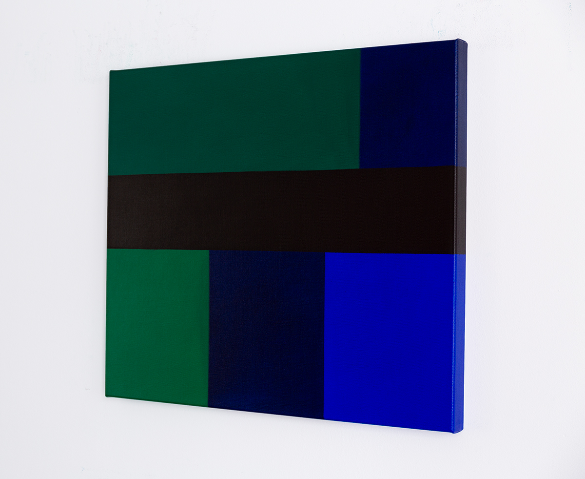 Painting: Abstract geometric colorfield painting with blue, green and very dark red shapes.