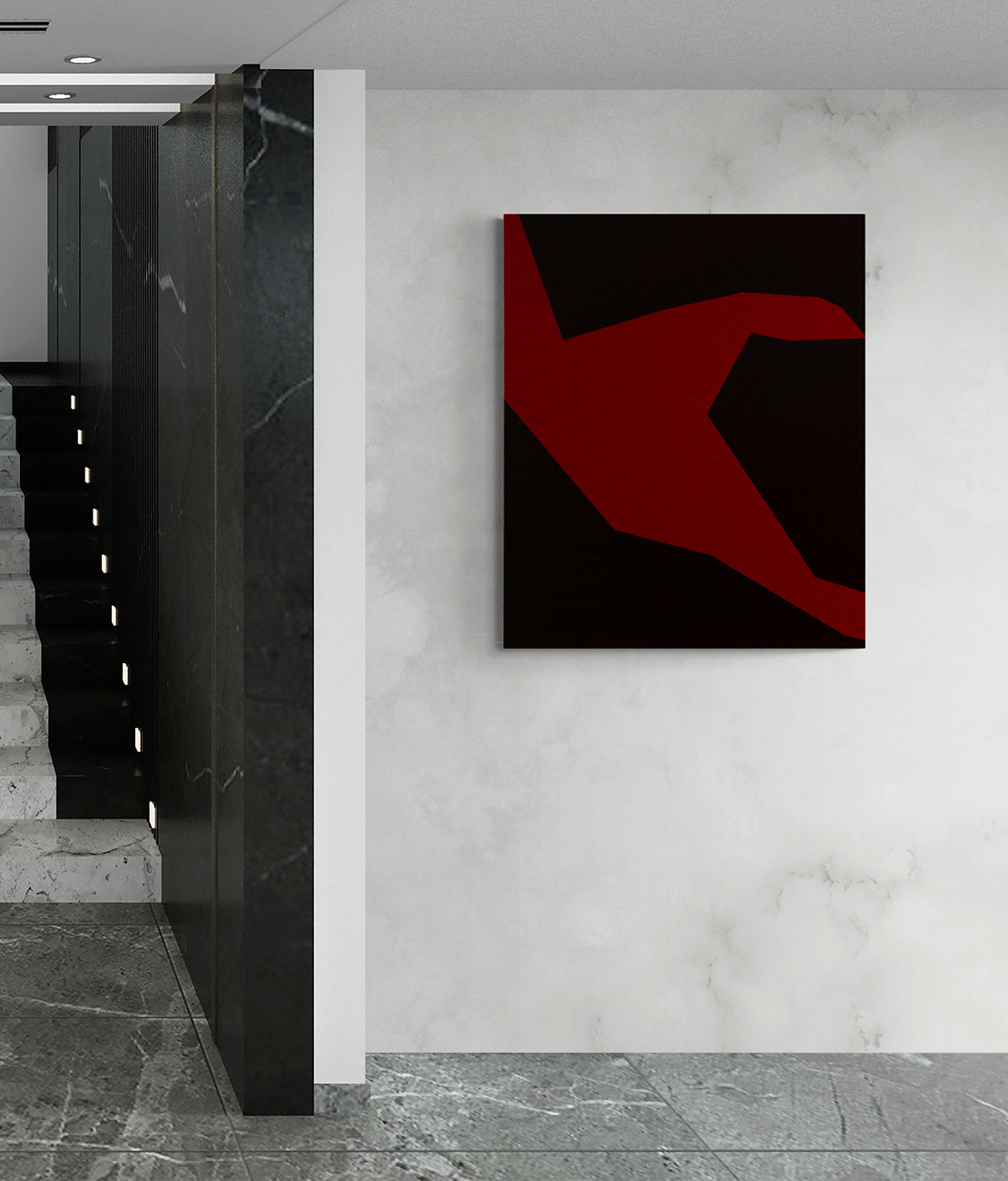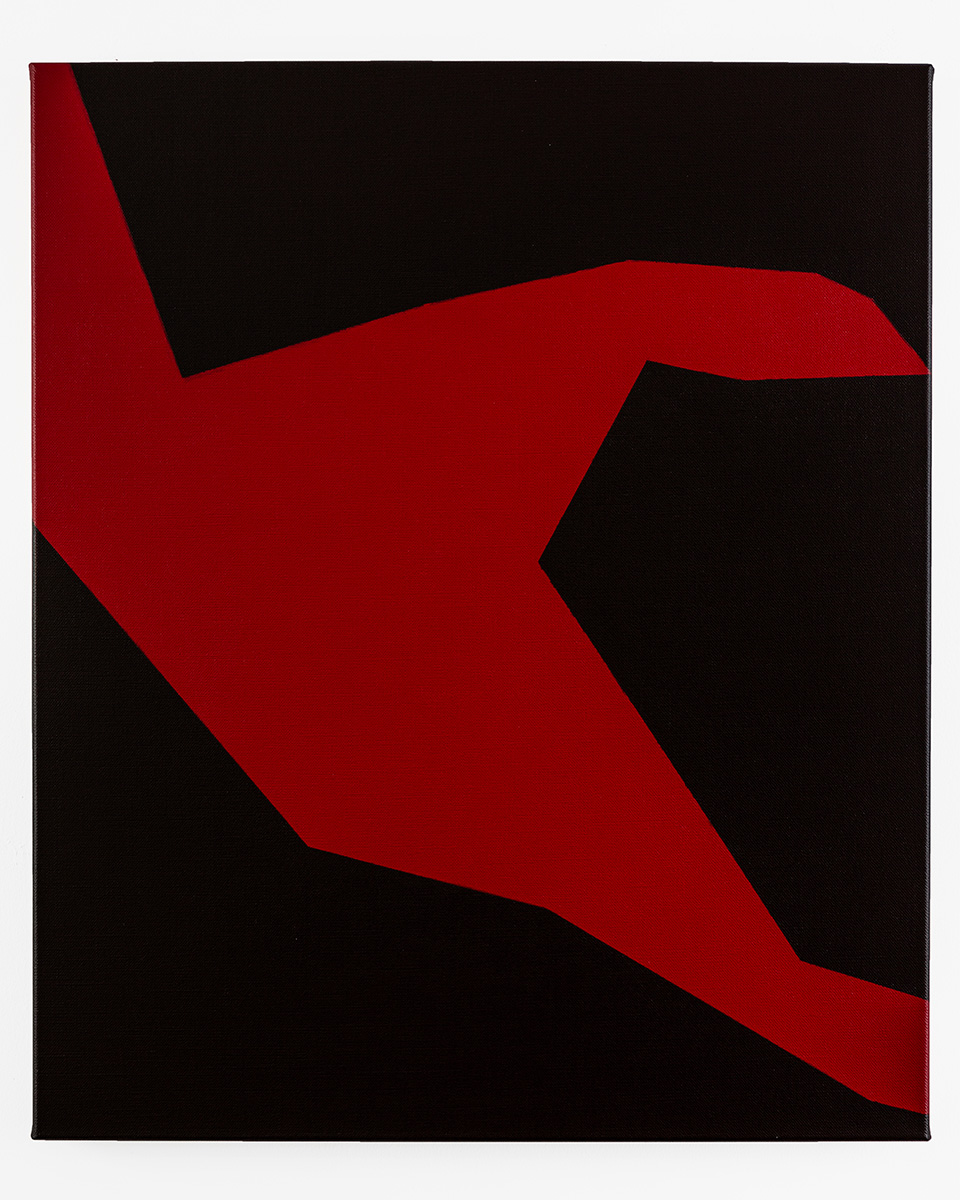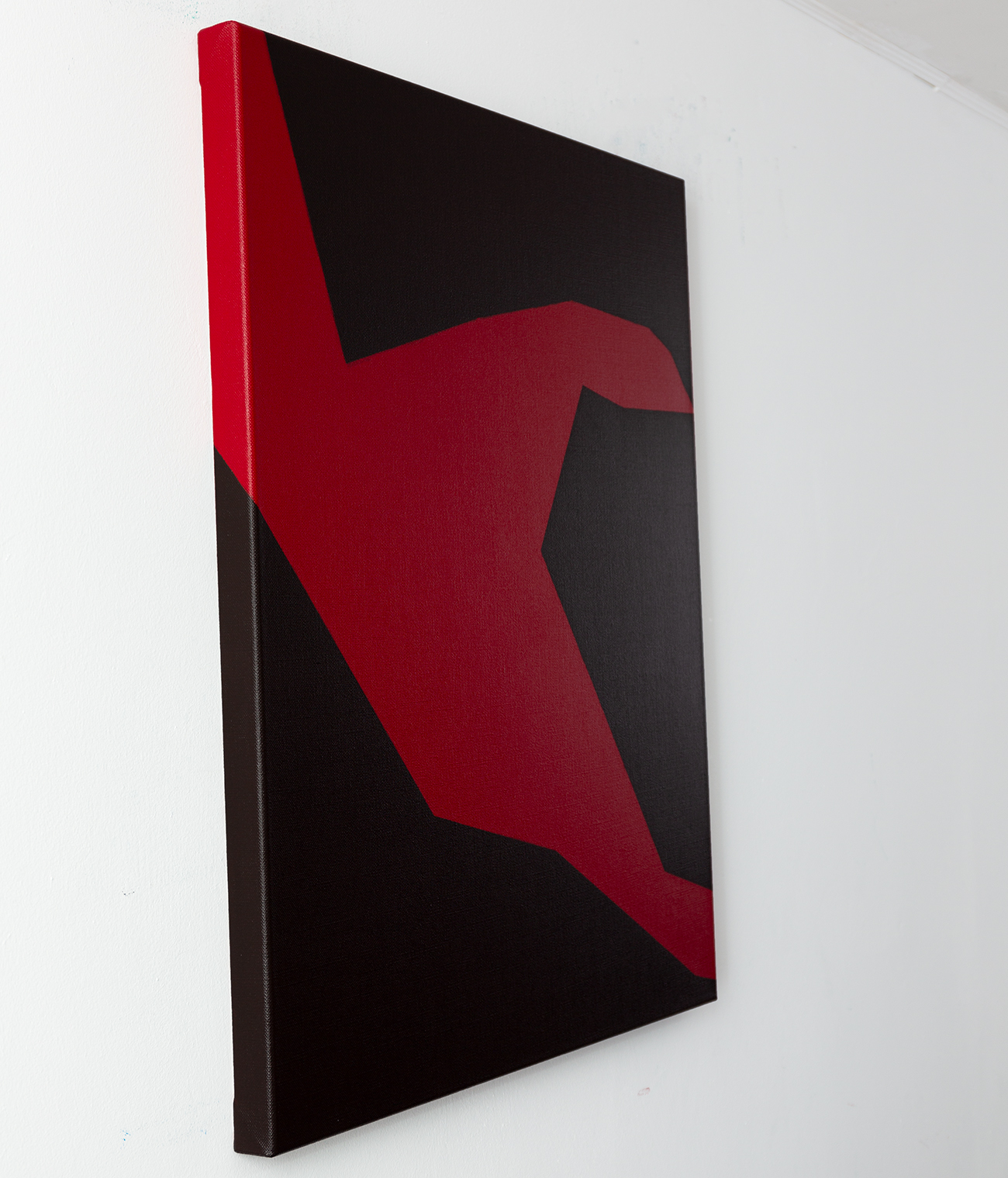 Painting: Abstract with a red shape spreading across a dark field. Minimalistic colorfield painting.