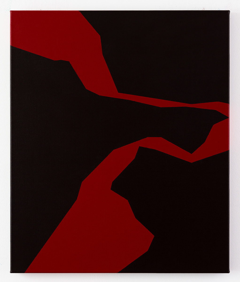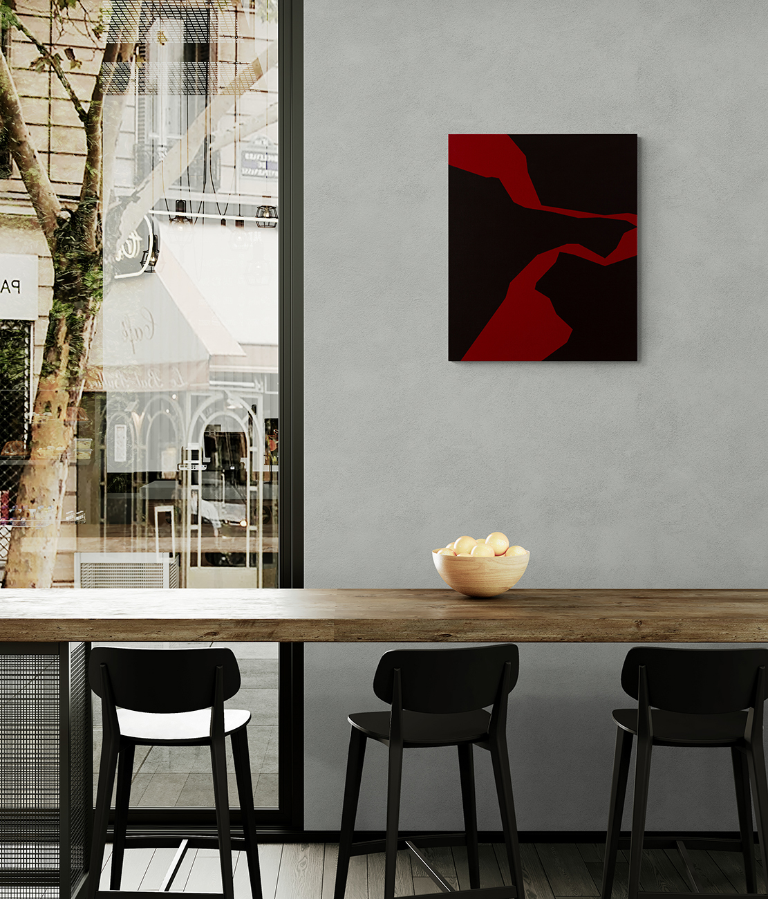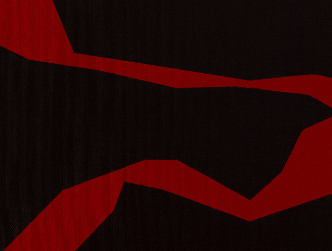 Gemälde: Abstrakt, mit einer roten Linie, die sich zur Form entwickelt und ein dunkles Feld durchläuft. Minimalistische abstrakte Farbfeldmalerei.