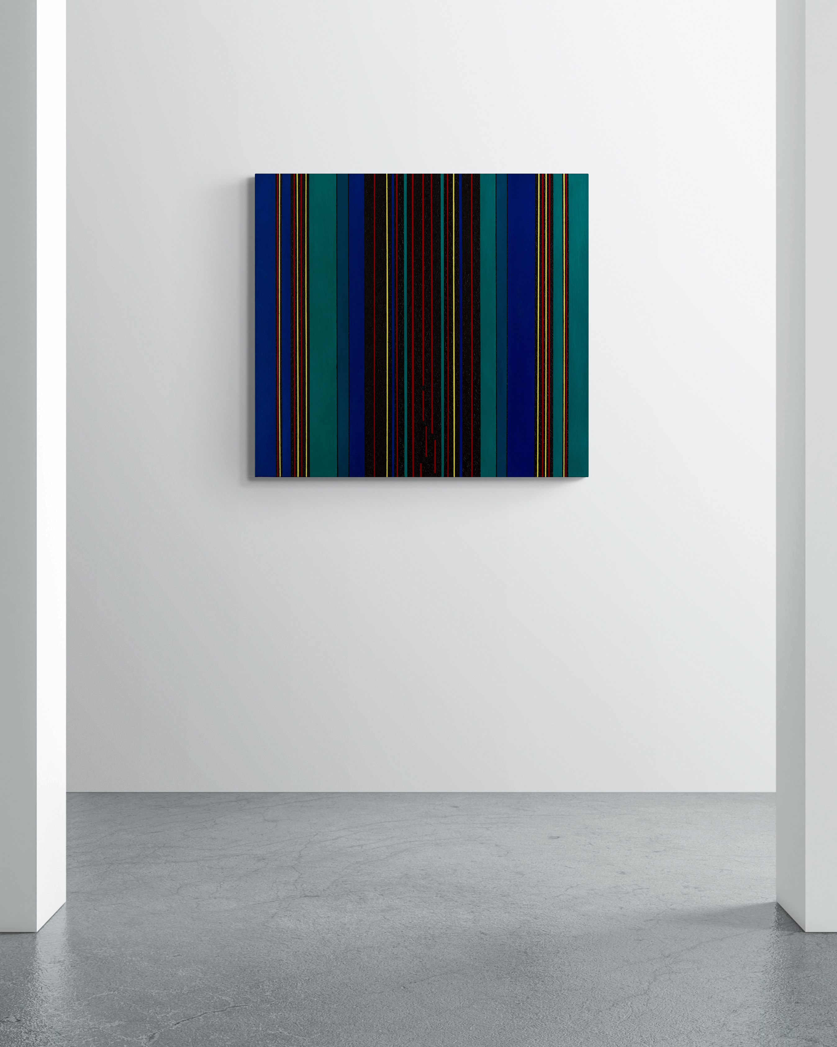 Gemälde: Geometrisch, abstrakt mit senkrechten blauen, grünen, roten, schwarzen und gelben Streifen. Minimalistische Streifen Farbfeldmalerei.
