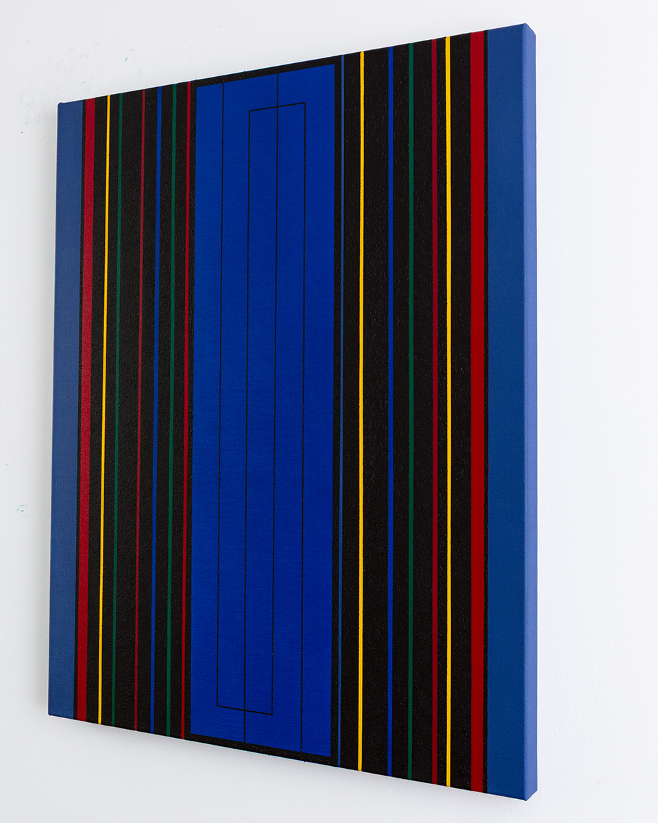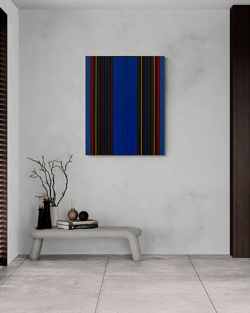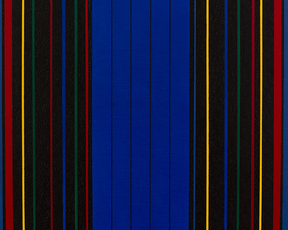 Gemälde: Geometrisch, abstrakt mit senkrechten blauen, grünen, roten, gelben und schwarzen Streifen. Minimalistische Streifen Farbfeldmalerei.