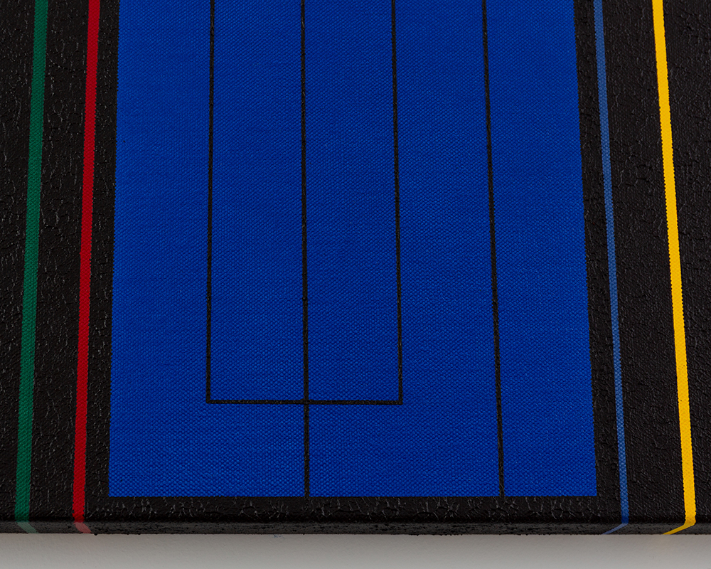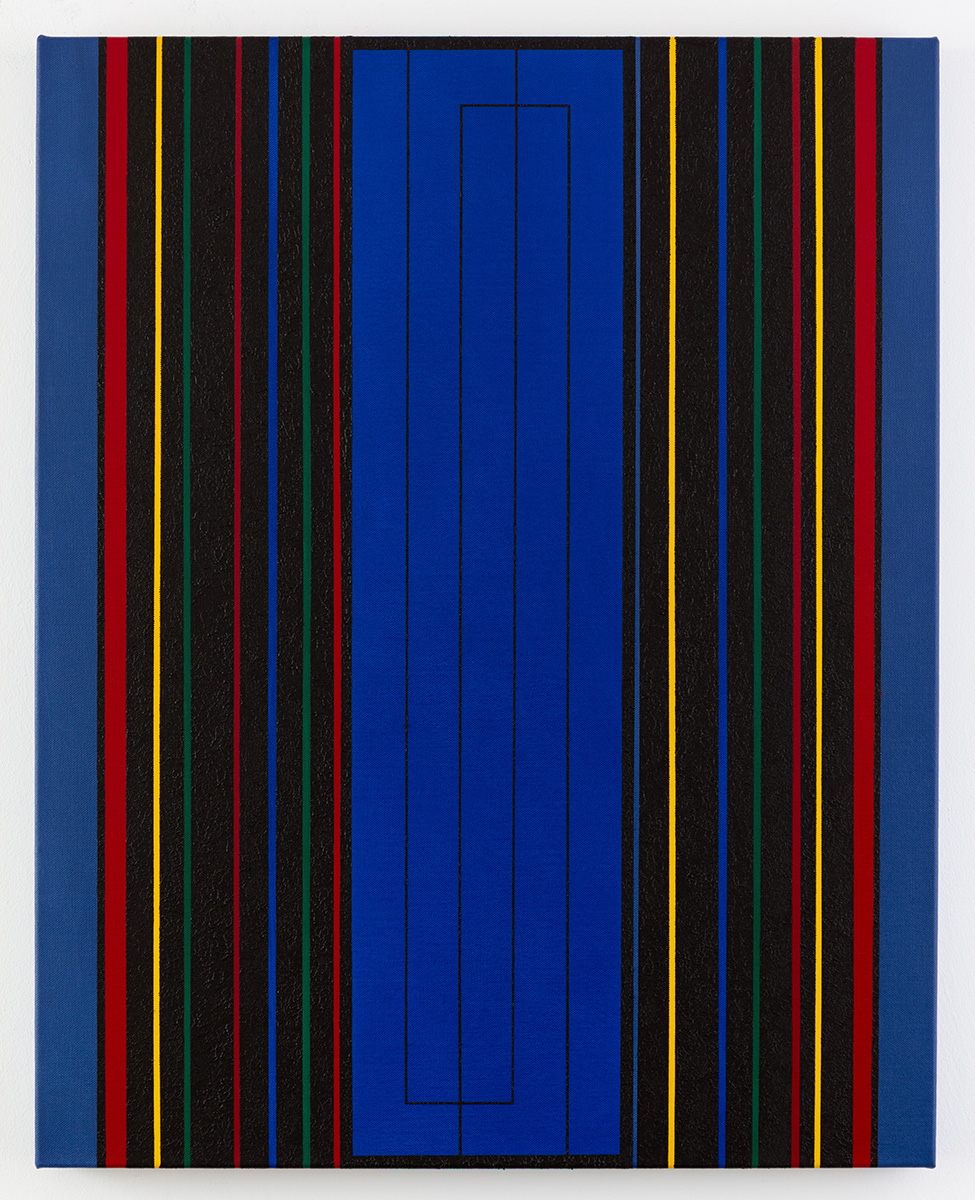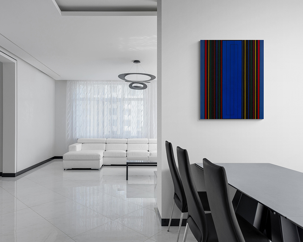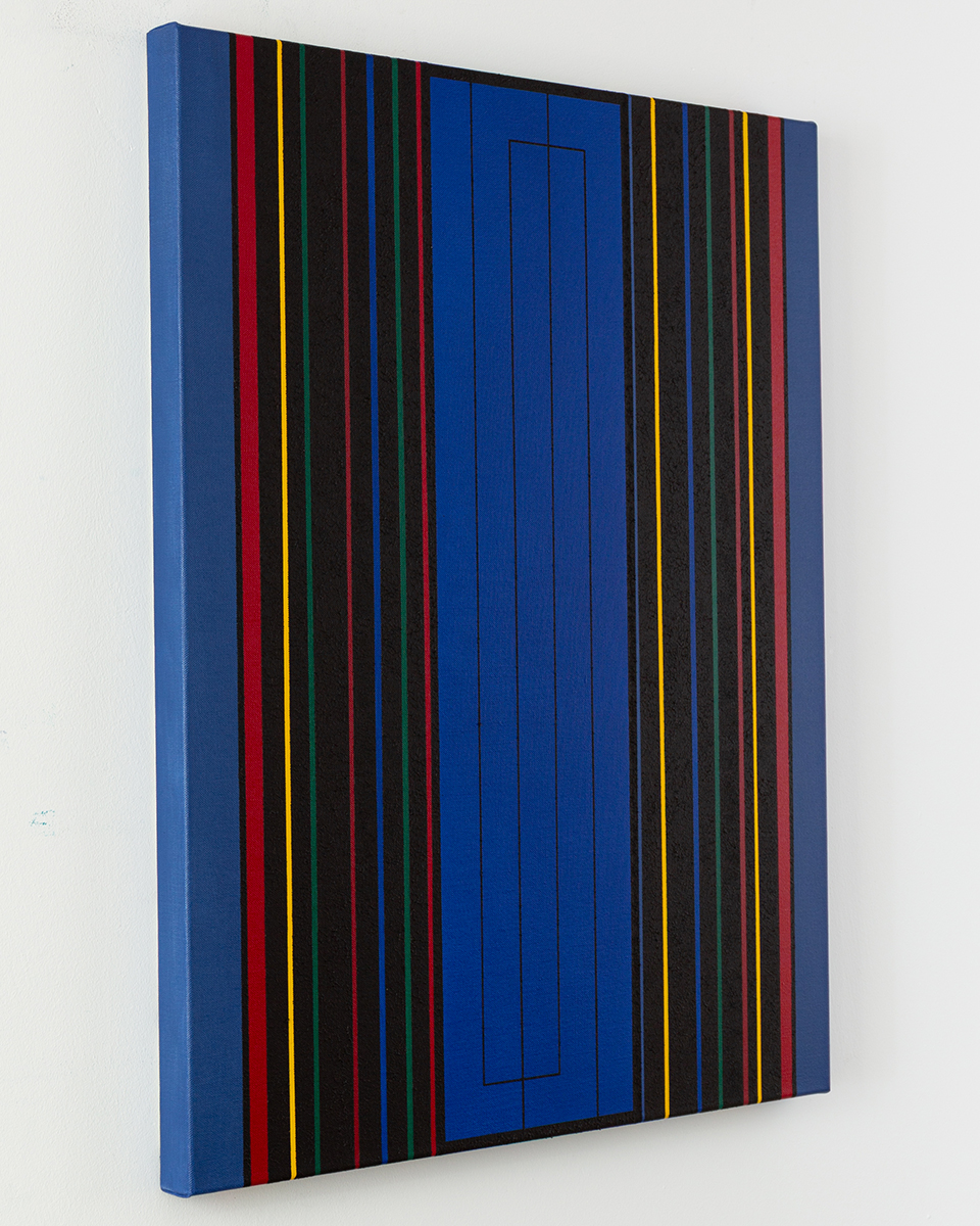 Gemälde: Geometrisch, abstrakt mit senkrechten blauen, grünen, roten, gelben und schwarzen Streifen. Minimalistische Streifen Farbfeldmalerei.